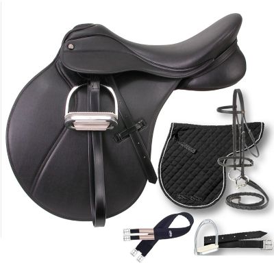 - Includes: a saddle, stirrup leathers, stirrup irons, stirrup pads, web girth, quilted cotton, and a laced snaffle bridle